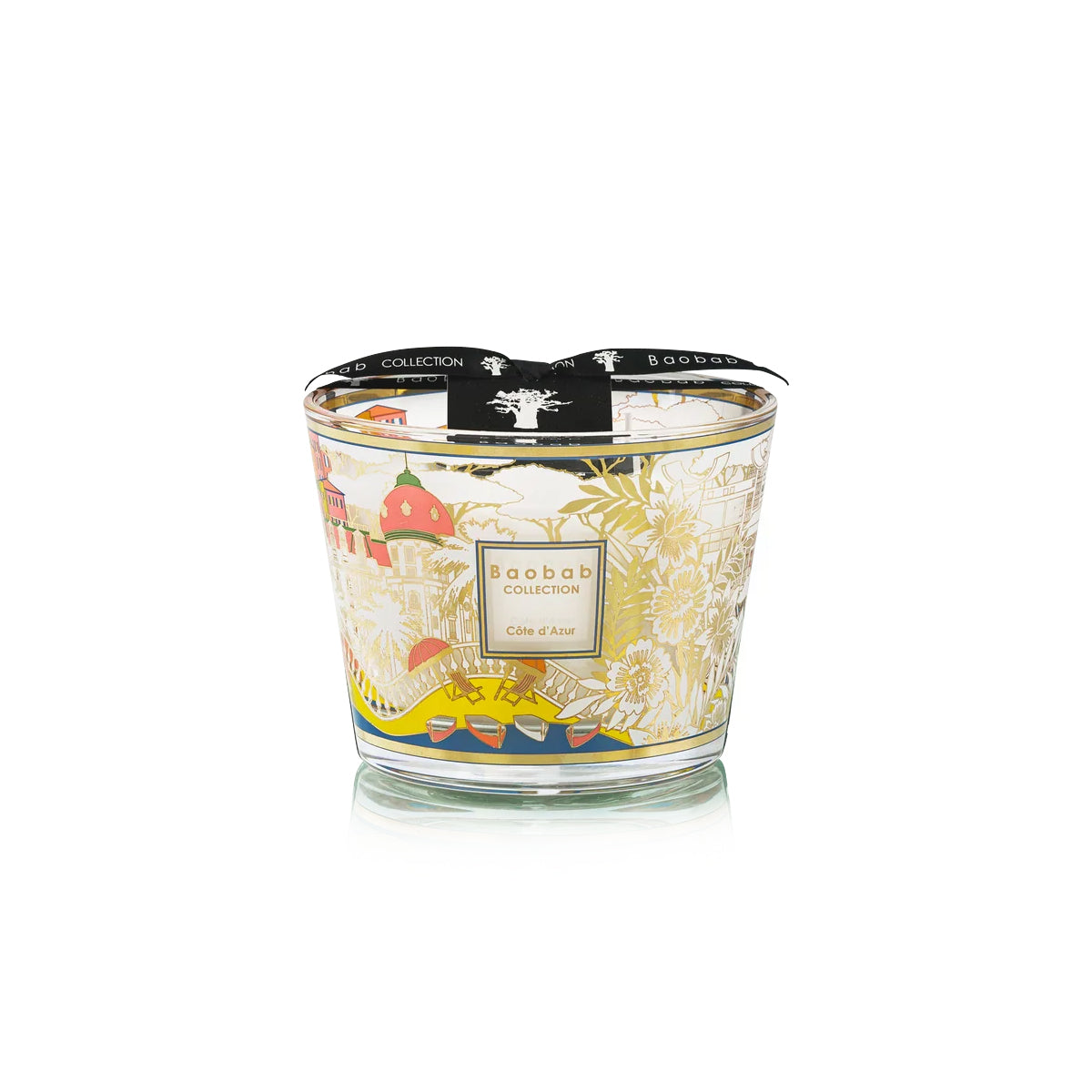 The screen-printed decor for the Côte d’Azur candle was inspired by some of the elements in Thierry Larcher’s design, such as the Negresco and the legendary Promenade des Anglais. We wanted to go a step further by incorporating architectural elements from the town of Menton and the town of Saint-Tropez. In the hinterland, you can imagine forests of umbrella pines and dream of visiting the Maeght Foundation in the heights of Saint-Paul-de-Vence.