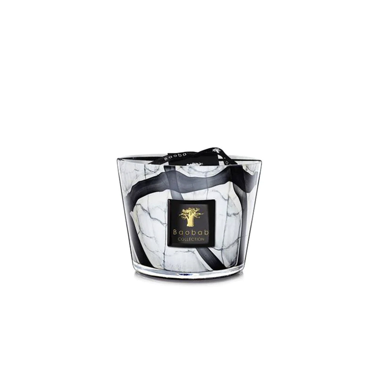 The scented candle is set in a hand blown glass replicating grey marble with black strokes edged with beige. The elegance of the glass reveals the flame, giving an effect of a luminous stone.