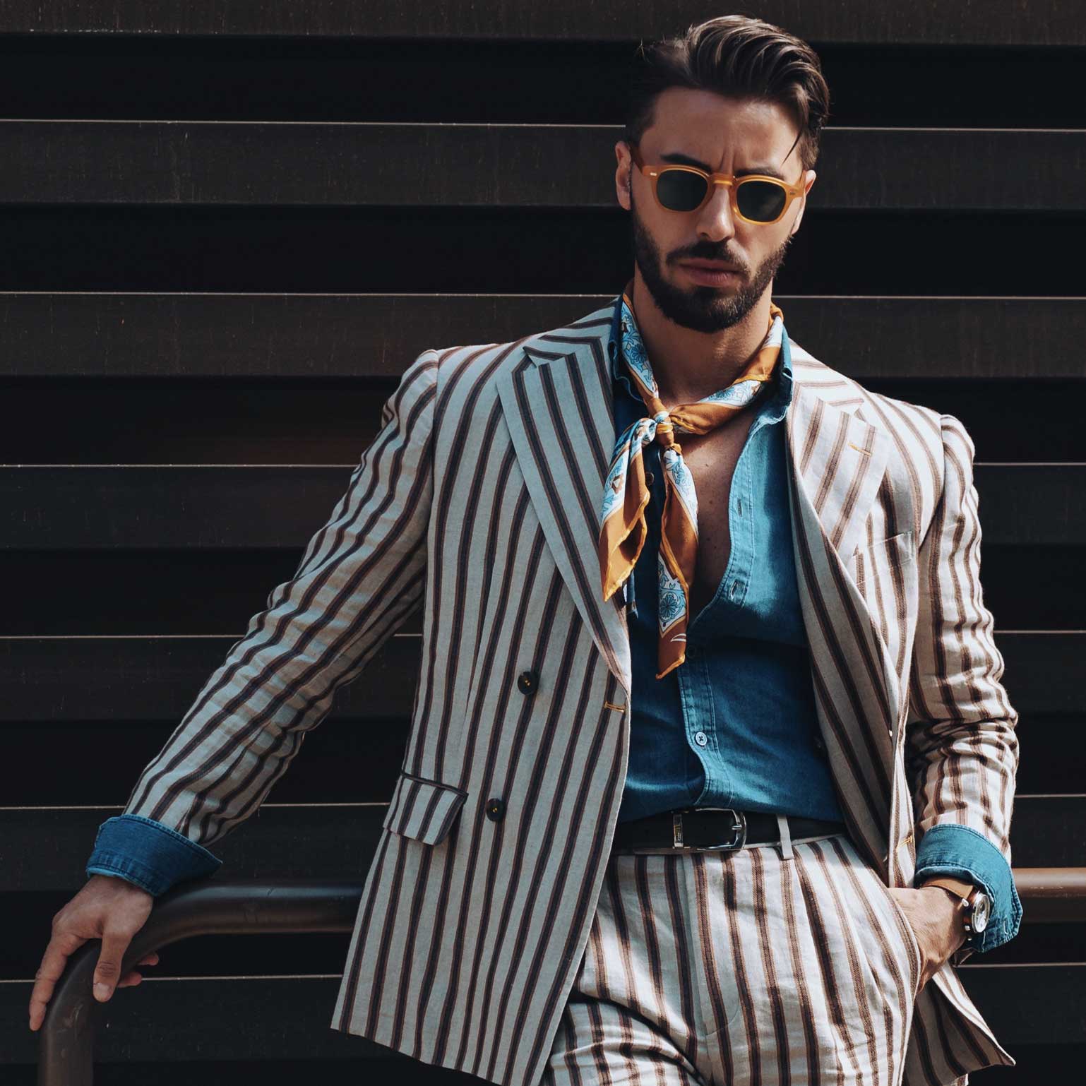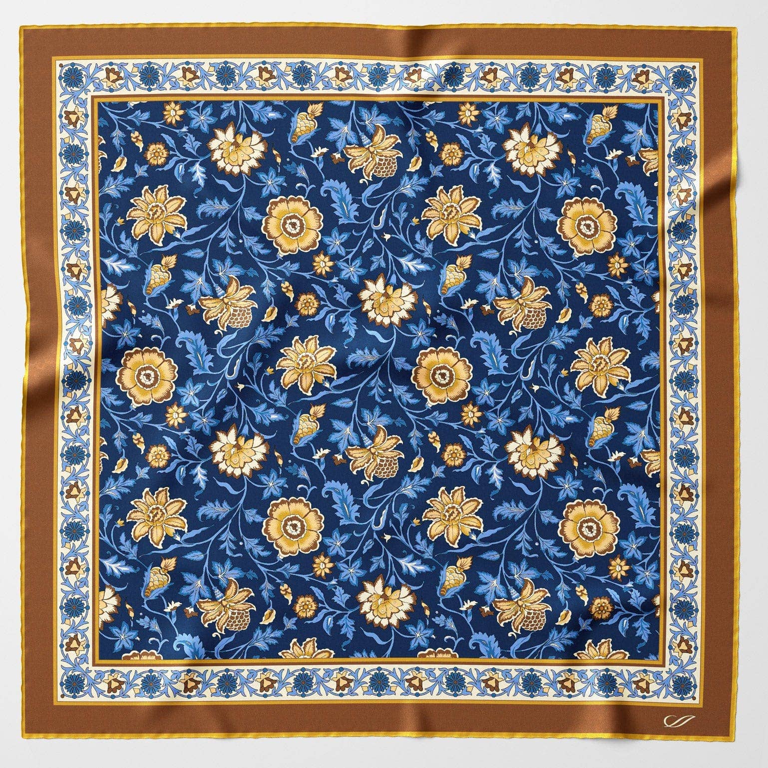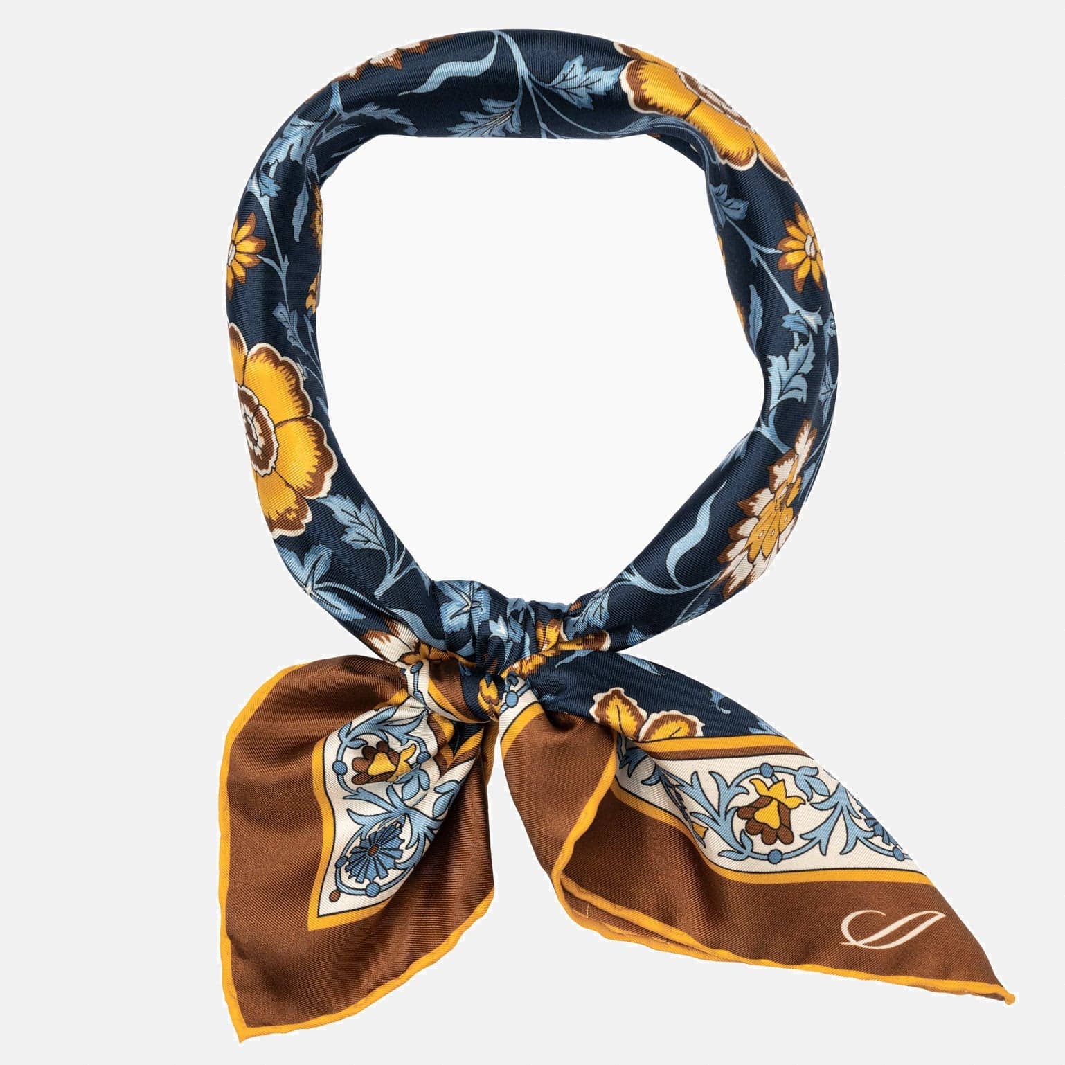 Set a new standard of style sophistication - it's the details that set you apart. Discover the transformative power of an Elizabetta neckerchief. This versatile wardrobe staple changes your style from classic elegance to modern suave, with a dash of charm or a bold, edgy twist. This floral pattern in shades of navy blue, mustard and yellow with hand-rolled hems will give your look an elegant twist. This scarf is a testament to timeless craftsmanship, a blend of care, passion, and the beauty of handmade excellence.