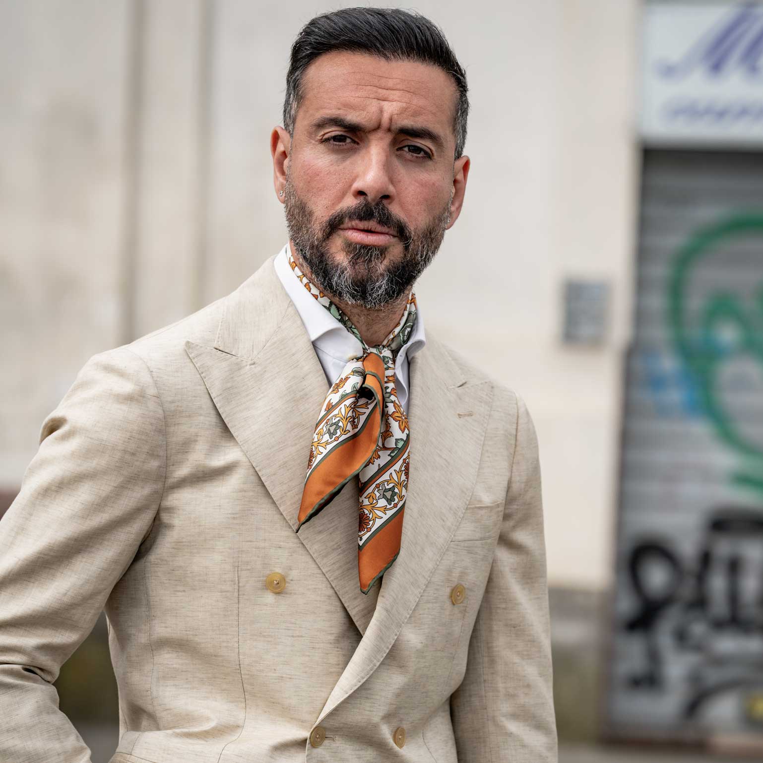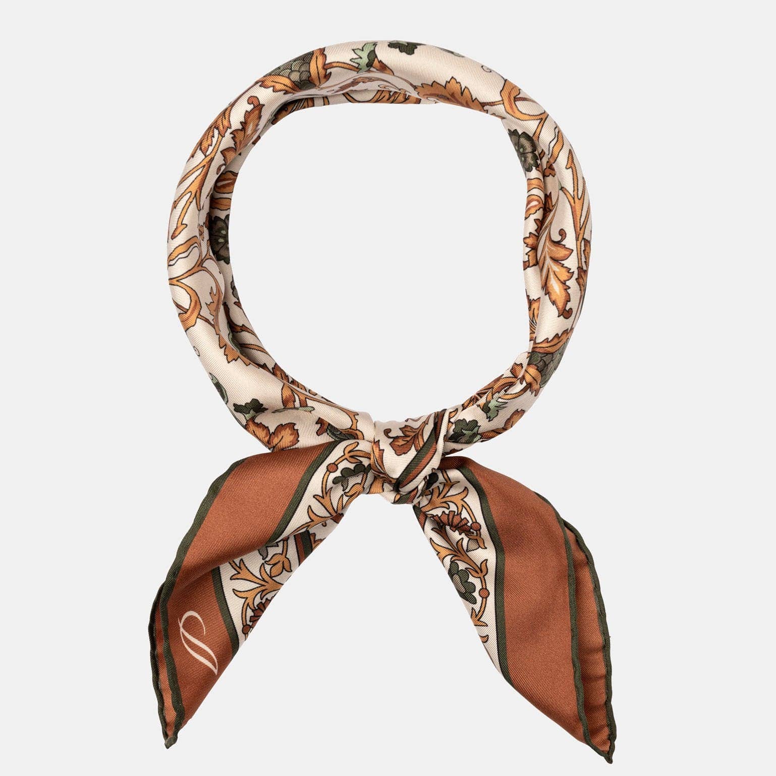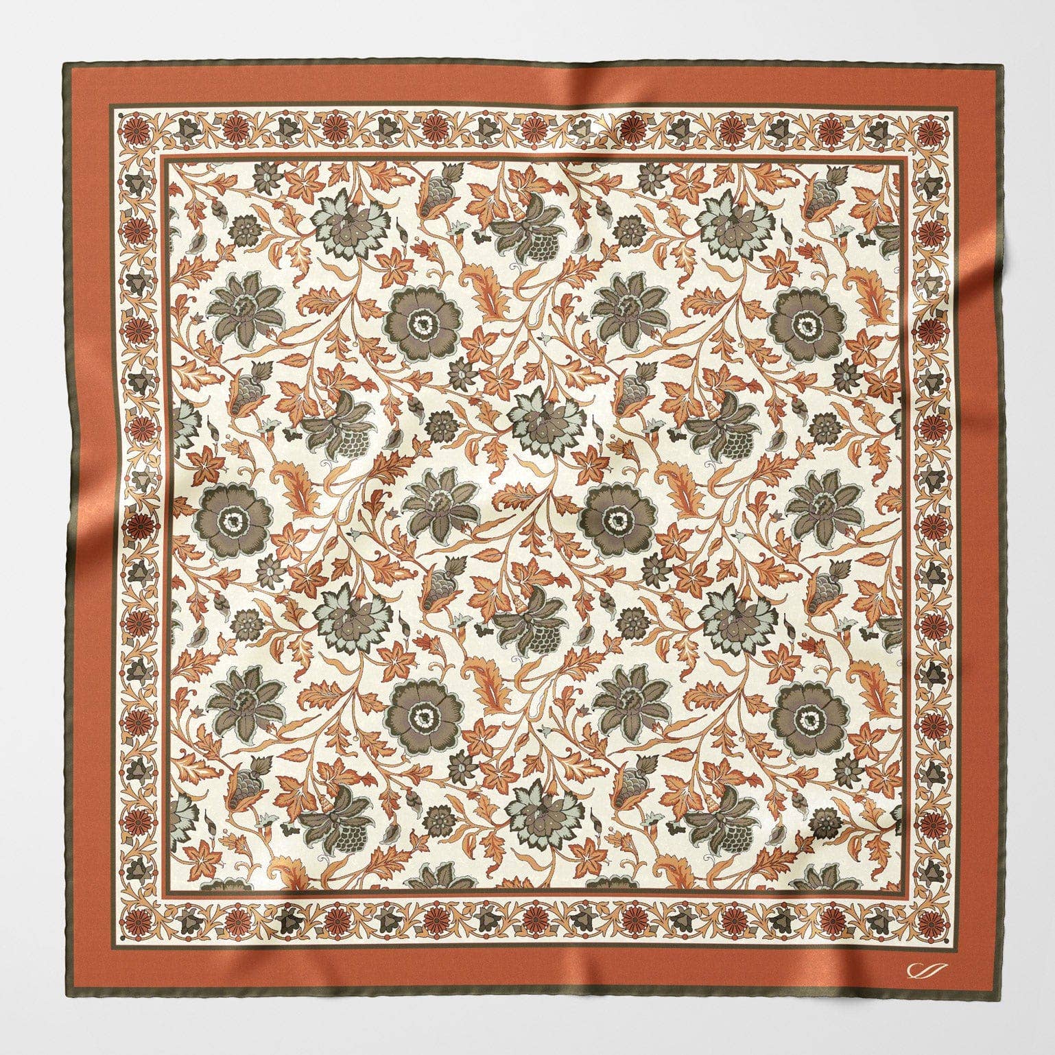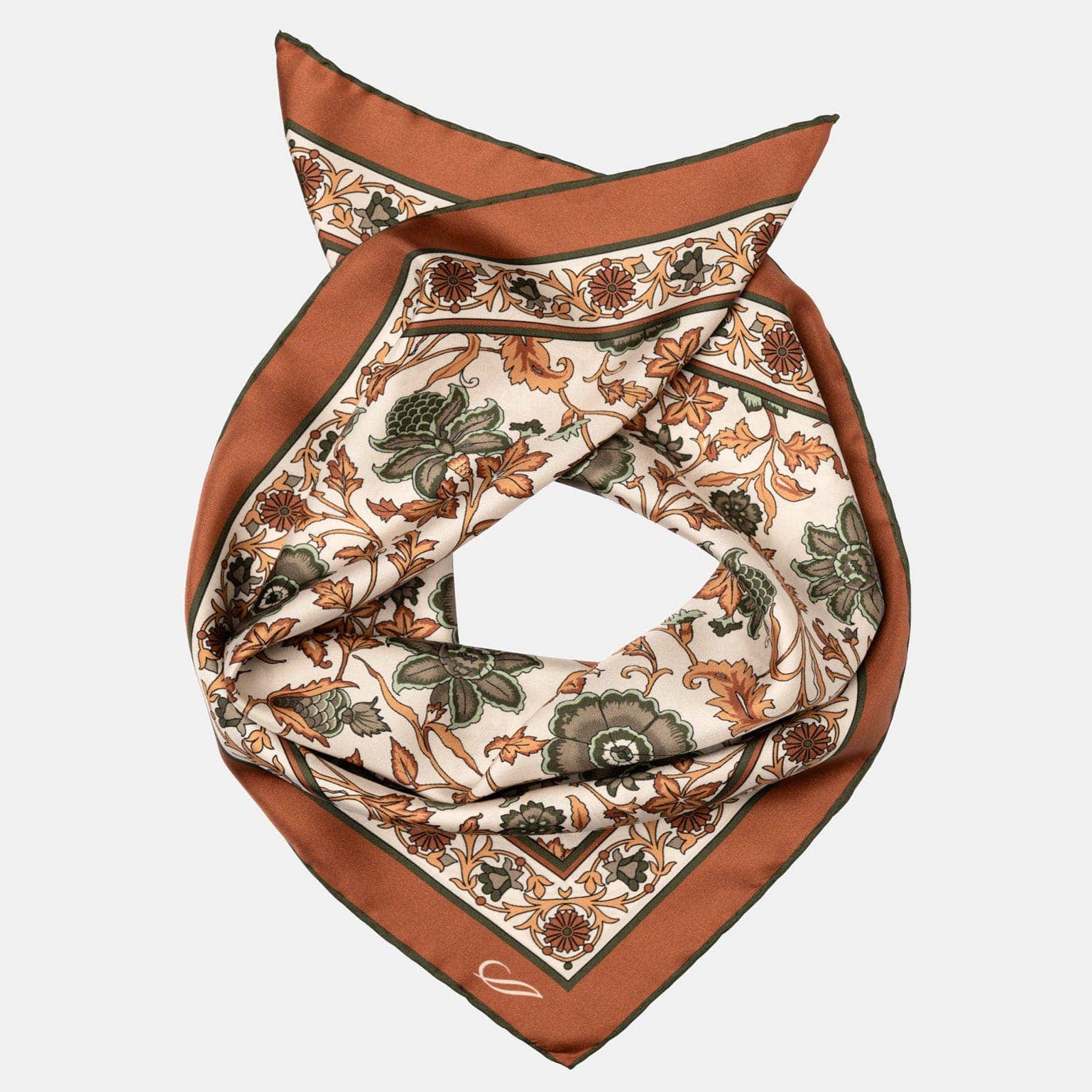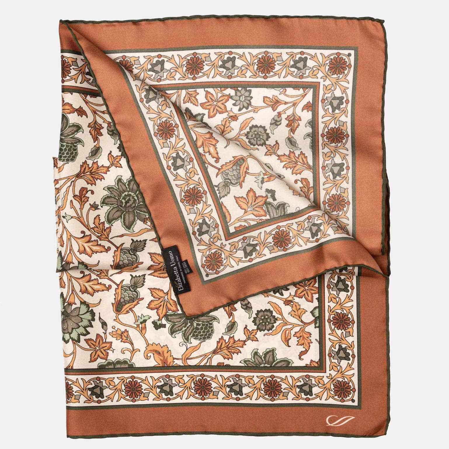 Set a new standard of style sophistication - it's the details that set you apart. Unlock the full potential of your wardrobe with the addition of an Elizabetta neckerchief that can effortlessly transform your look from timelessly classic to irresistibly suave, from charmingly rakish to daringly edgy. This floral pattern in shades of terracotta and sage green with hand-rolled hems will give your look an elegant twist. This scarf is a testament to timeless craftsmanship, a blend of care, passion, and the beauty of handmade excellence.