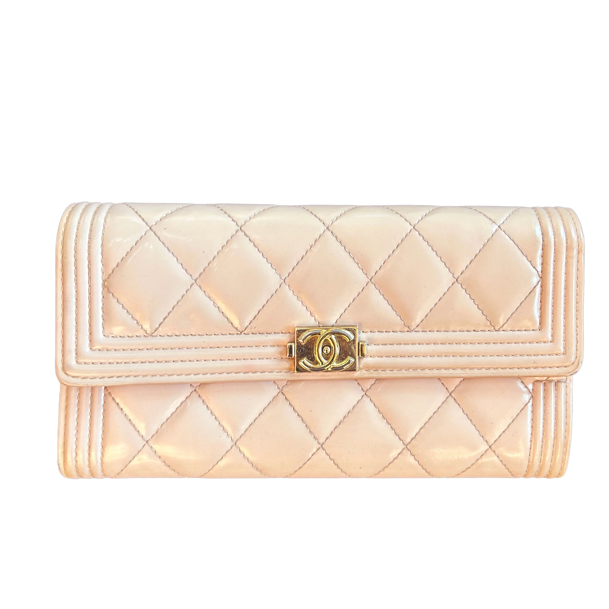 Pre-loved Chanel Quilted Patent Leather Boy Flap Wallet in Beige. A timeless long wallet , this Chanel wallet is a collectors must have. Its beautiful beige patent leather exterior adorning a gold 'CC' logo and matching calfskin leather interior will coordinate with every bag in your closet. Open it up to reveal ample pocket storage for cash, coins, cards and more.