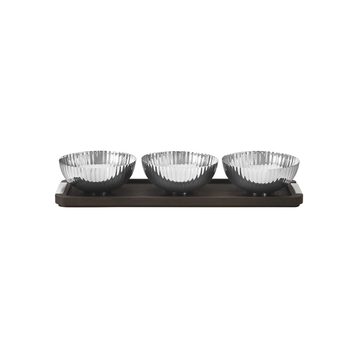 Elevate your entertaining! Make sure all the little details are perfect and serve your snacks in this beautiful set of three stainless steel bowls presented on a custom-made smoked oak tray. Just the right size to hold candies, nuts or berries, the bowls feature the distinctive Art Deco-inspired grooves that appear in many of legendary designer Sigvard Bernadotte’s iconic pieces. The versatile nature of the set means that both tray and bowls can also be used individually.