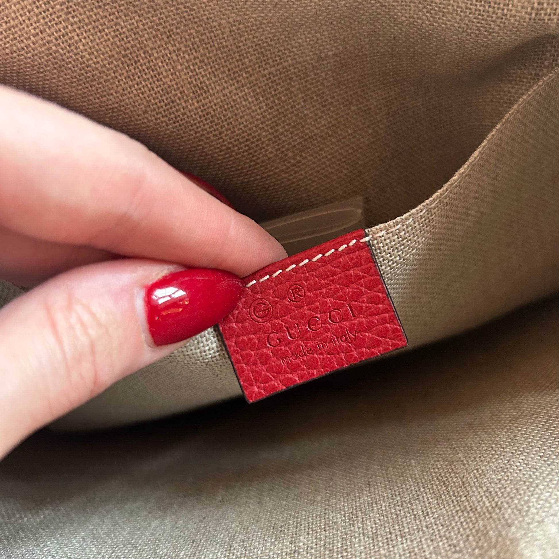 Gucci Red Pebbled Leather Zip Clutch with Braided Tassels, Bamboo Accent.