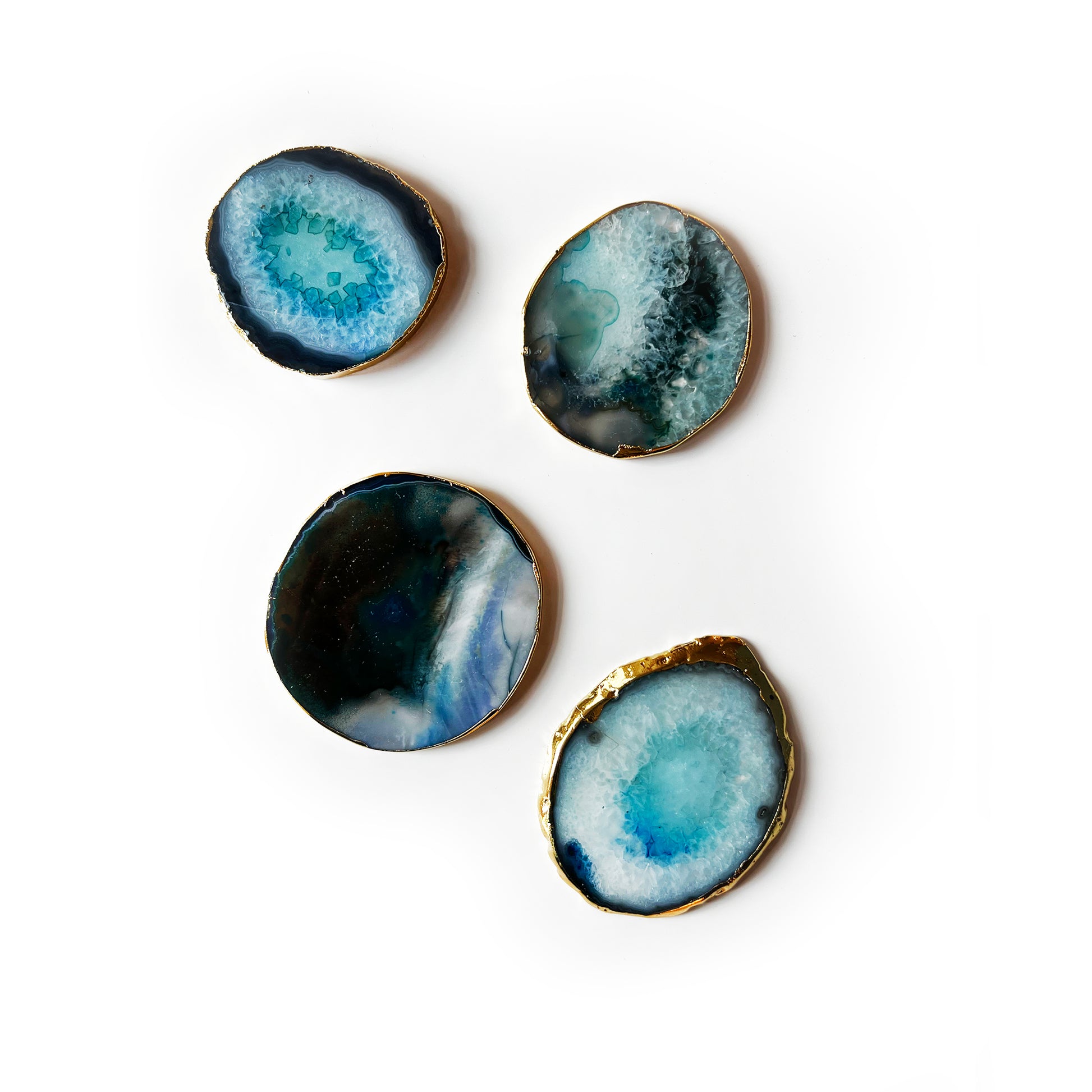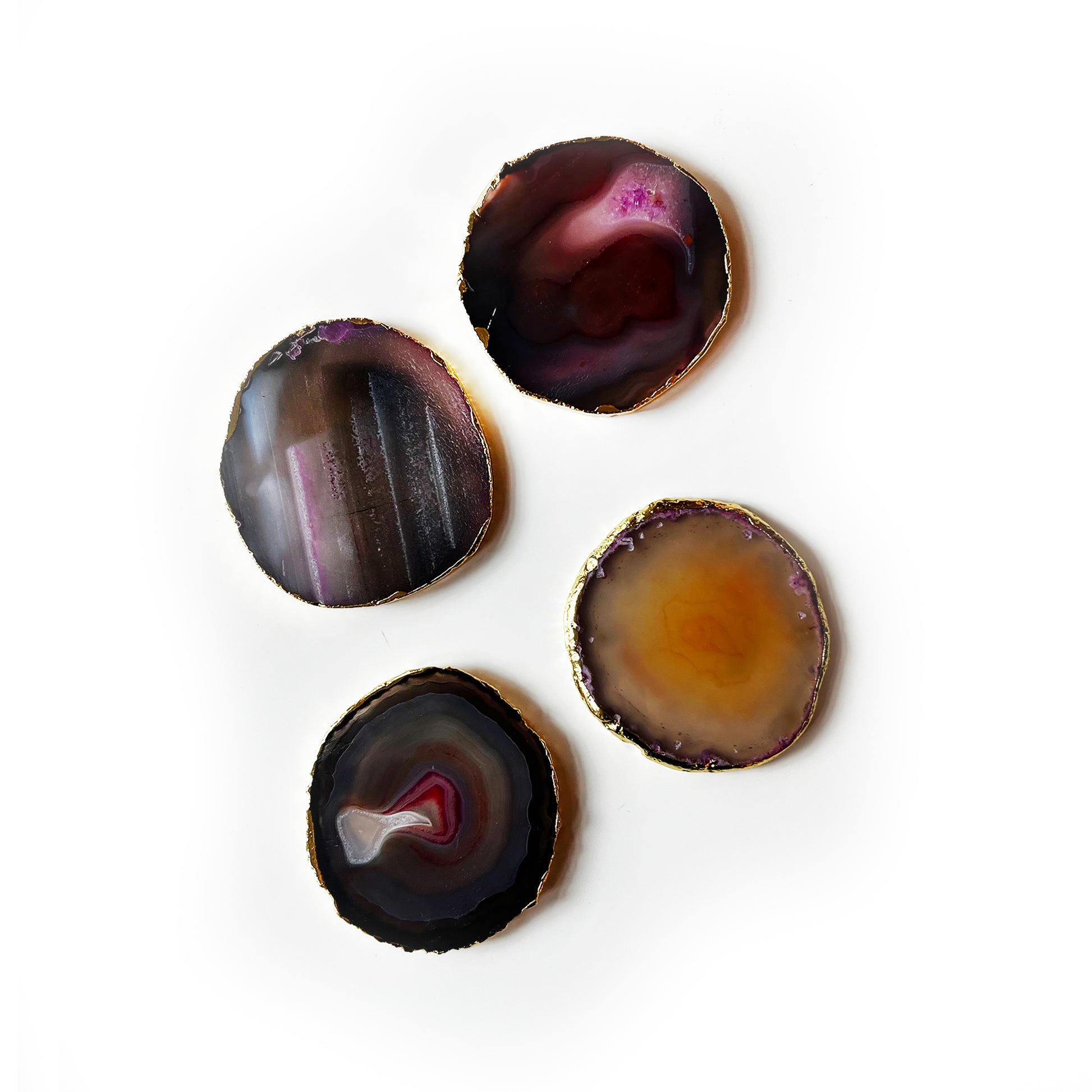 Modern, elegant, and unique! These handmade agate coasters make a thoughtful hostess or housewarming gift for someone who loves to entertain in style. Each coaster is unique in its cut, color, and shape. To craft each one-of-a-kind piece, raw stones are procured of the desired agate type, washed, cut to the desired thickness and shape, and finally buffed, polished and trimmed in gold.