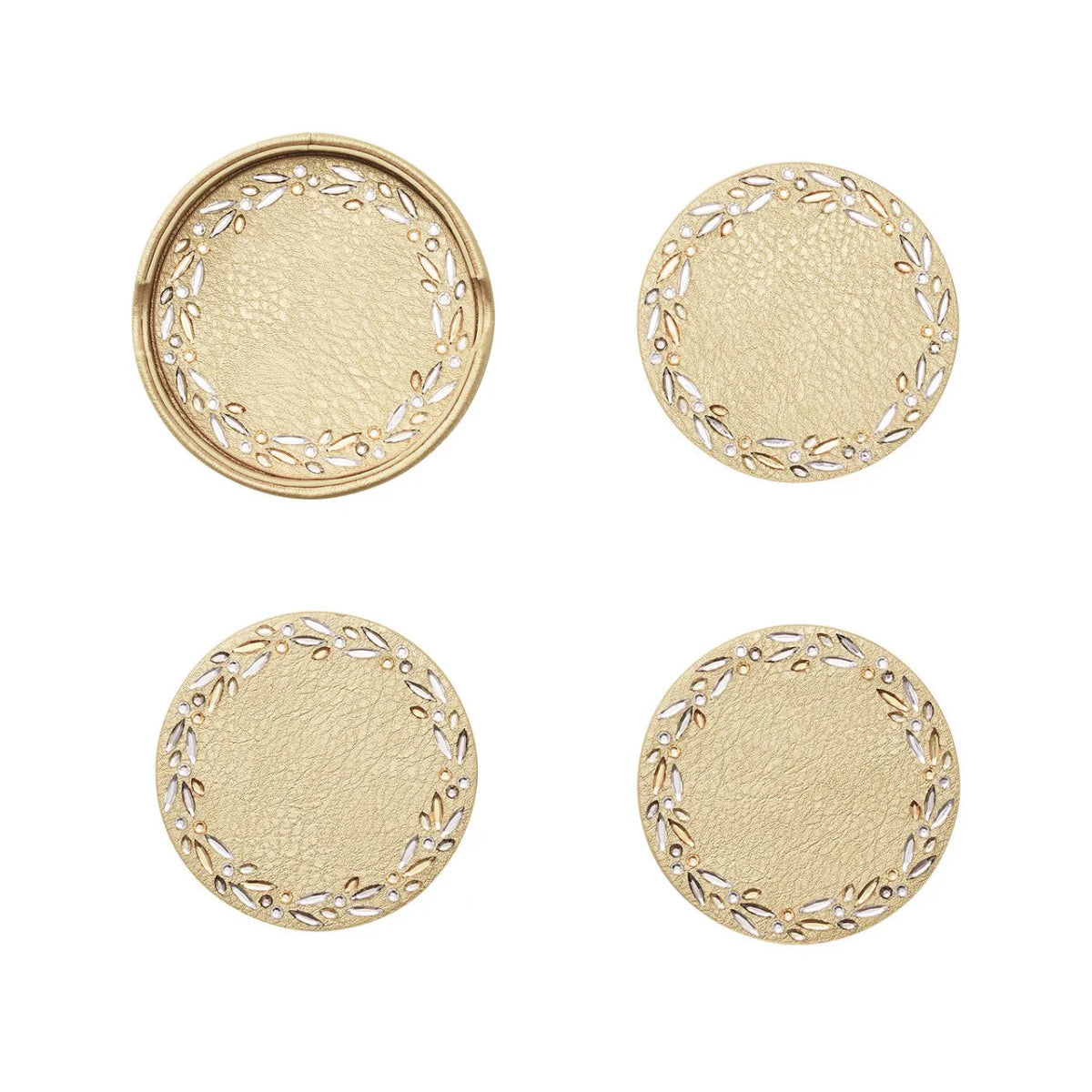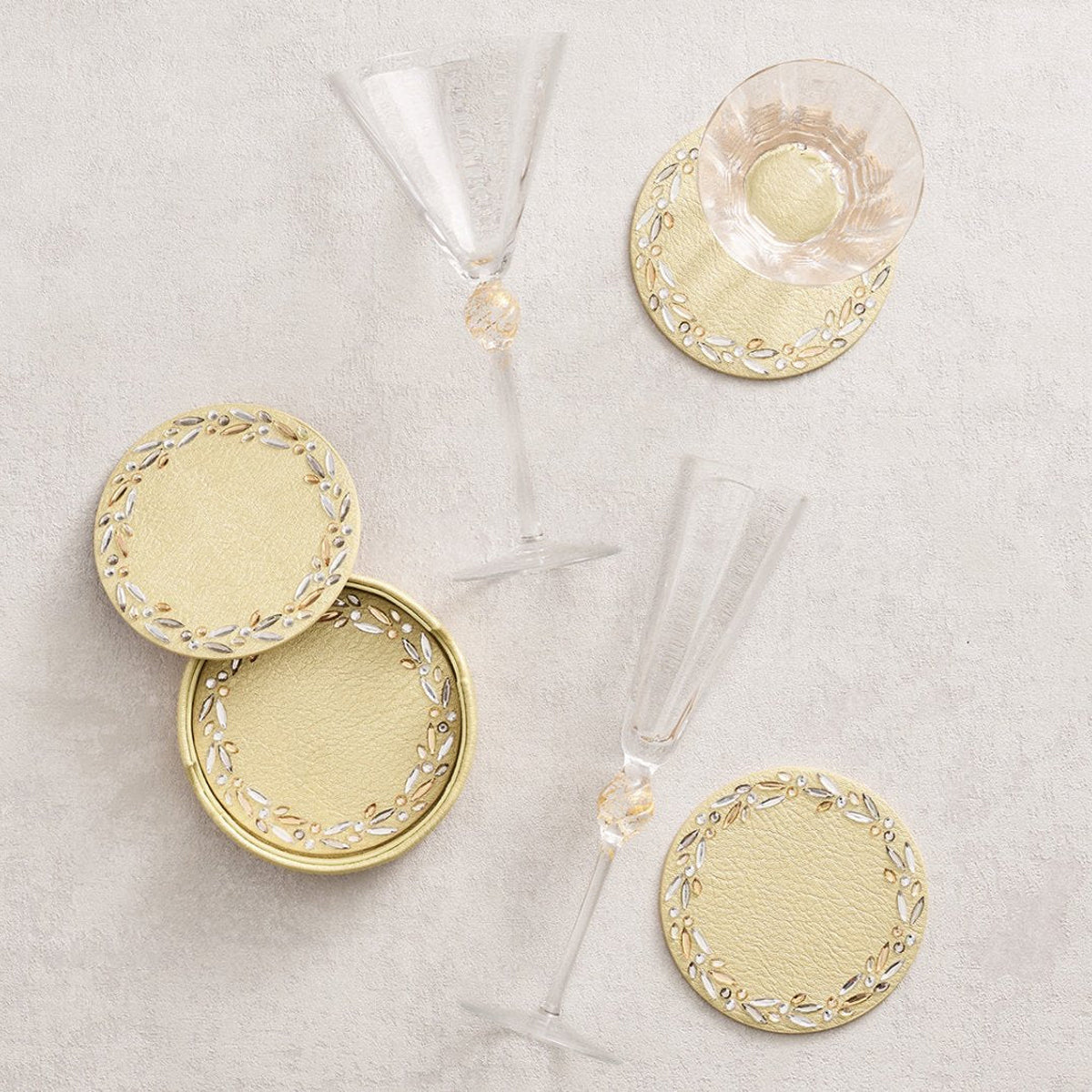 Add a touch of glamour to your party with the Bejeweled Coasters. The matte gold coasters boast a wreath-like jeweled border, adorned with gold, silver, and champagne-colored gemstones. Whether it's a festive holiday party or a more relaxed setting, these coasters are the perfect accessory, bringing sparkle and pizzazz to your table. Perfect for gifting, these coasters are sold as a set of four in a stylish caddy.