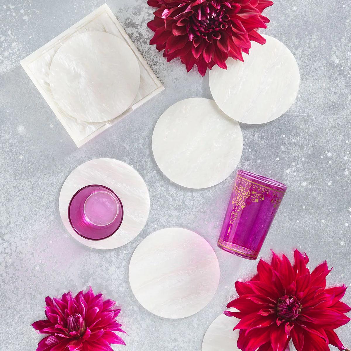 The design for the round, iridescent Mirage Drink Coasters comes from the optical illusion of light refraction. The drink coasters feature hand-poured acrylic in a pearlescent, which gives them a sleek aesthetic. They will work well for just about any occasion throughout the year. And any hostess would welcome these as fabulous gifts.