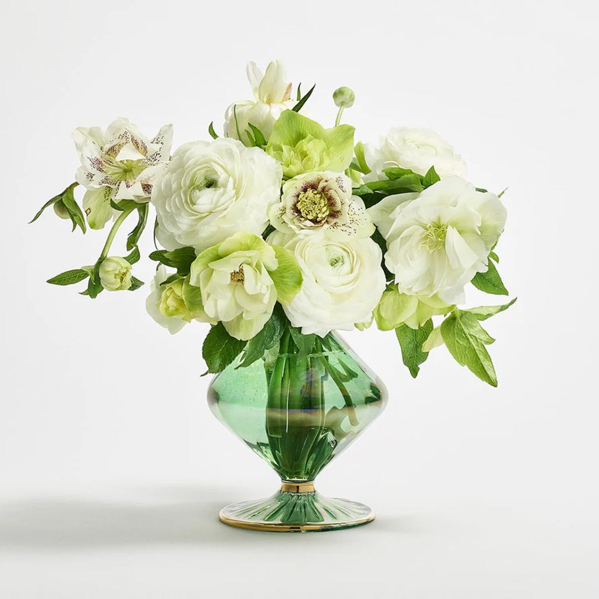 The mouth-blown glass Scallop Bud Vase is produced by hand-molding and applying the color, then baking at high temperatures, resulting in its gorgeous iridescent luster. 18K gold bands accent the rim and base of the stylish diamond-shaped vase. Expect shape, size and color variation due to their hand-crafted nature.