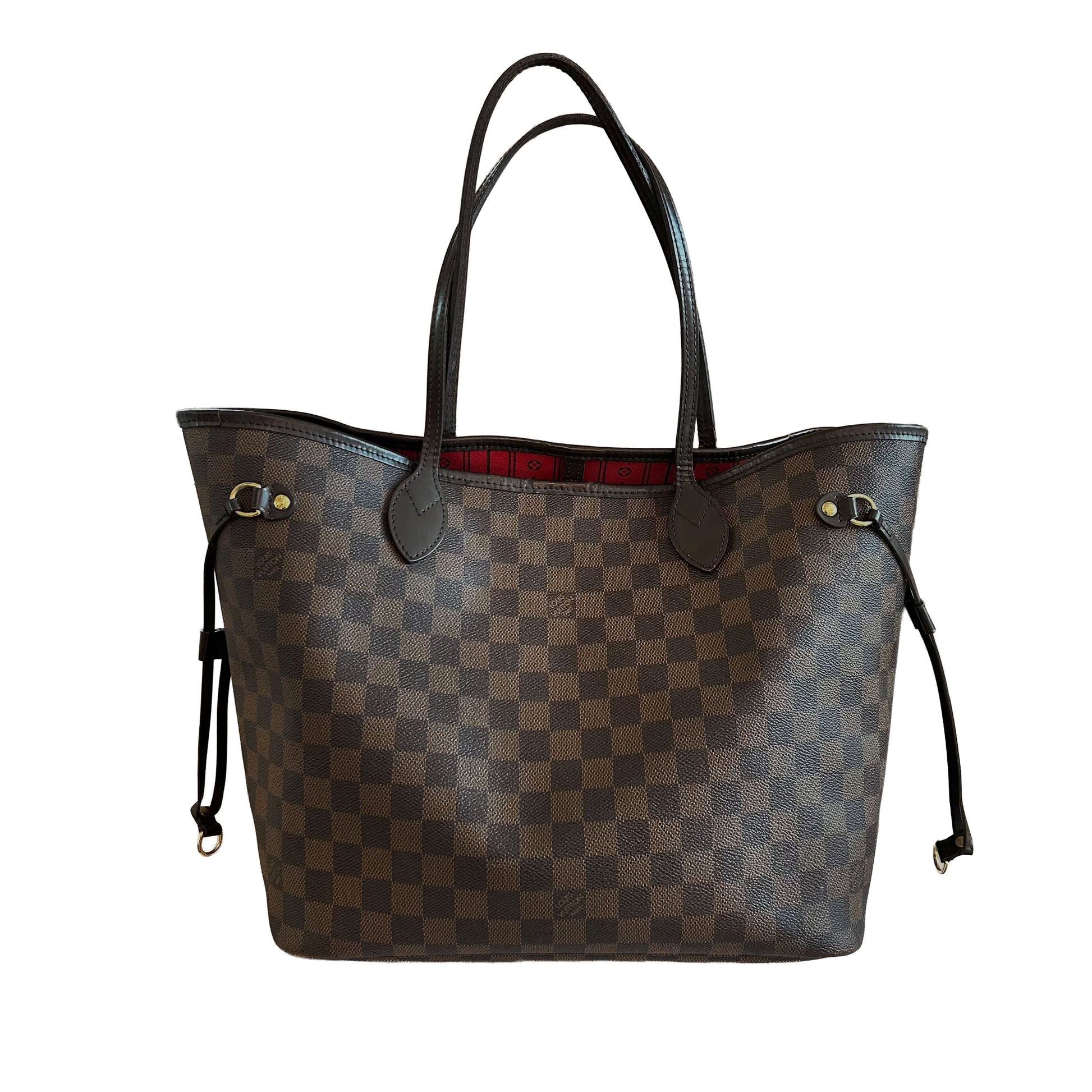 The Neverfull MM tote unites timeless design with heritage details. Elegant in Damier Ebene canvas with natural cowhide trim, it is roomy but not bulky, with side laces that cinch for a sleek allure or loosen for a casual look. Slim, comfortable handles slip easily over the shoulder or arm. Lined in colorful textile, it features a removable pouch which can be used as a clutch or an extra pocket.