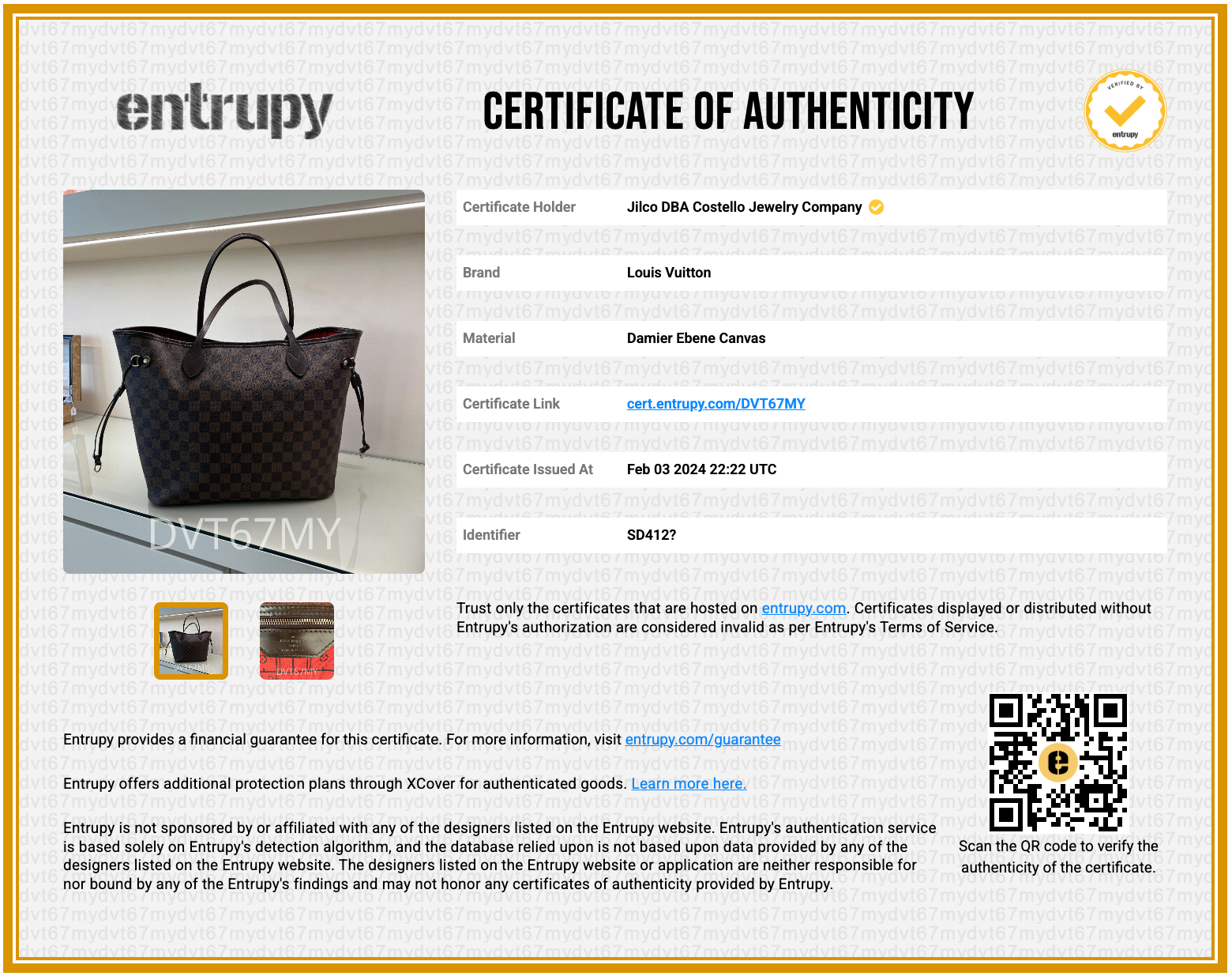 Entrupy authentication guarantee - cert.entrupy.com/dvt67my