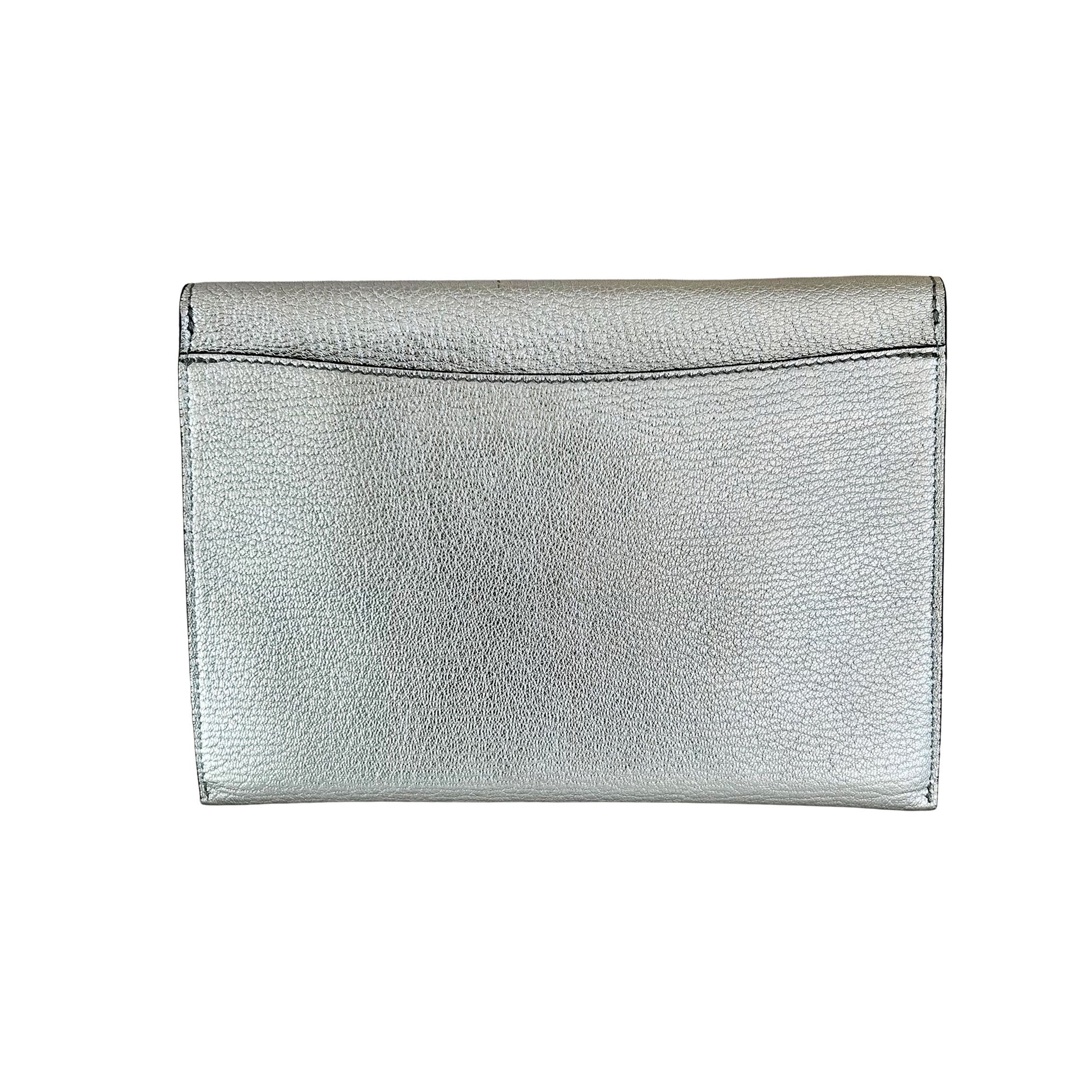 This pre-loved Burberry Silver D Ring Clutch is the perfect piece for a summer wedding guest! Wonderfully crafted of metallic silver calfskin leather, this clutch opens up to an olive green leather interior and features four card slots and a matching slim wallet.