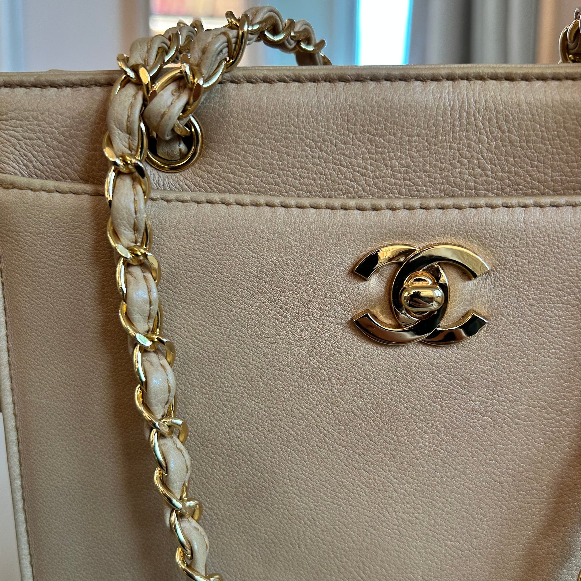 This pre-loved Chanel Lambskin Mini Shopper Tote is a beautiful companion for dinner dates, attending a wedding, or just upgrading any outfit. This classic bag features a gold tone chain-link shoulder strap and a gold Chanel CC logo on the front. The bag opens to a matching leather interior with a zipper compartment for cards and plenty of room in the main pocket for phone, lipstick, sunglasses and keys.