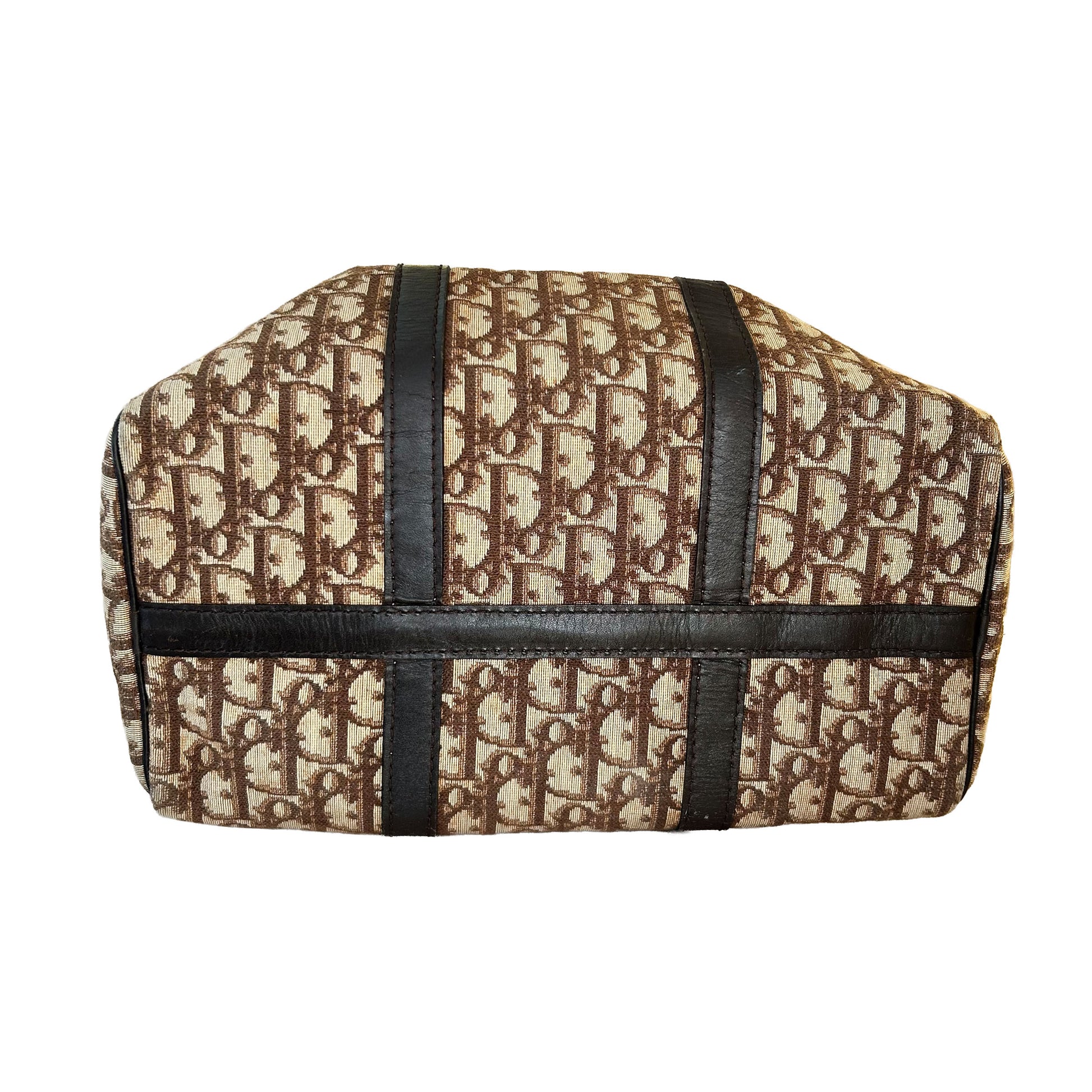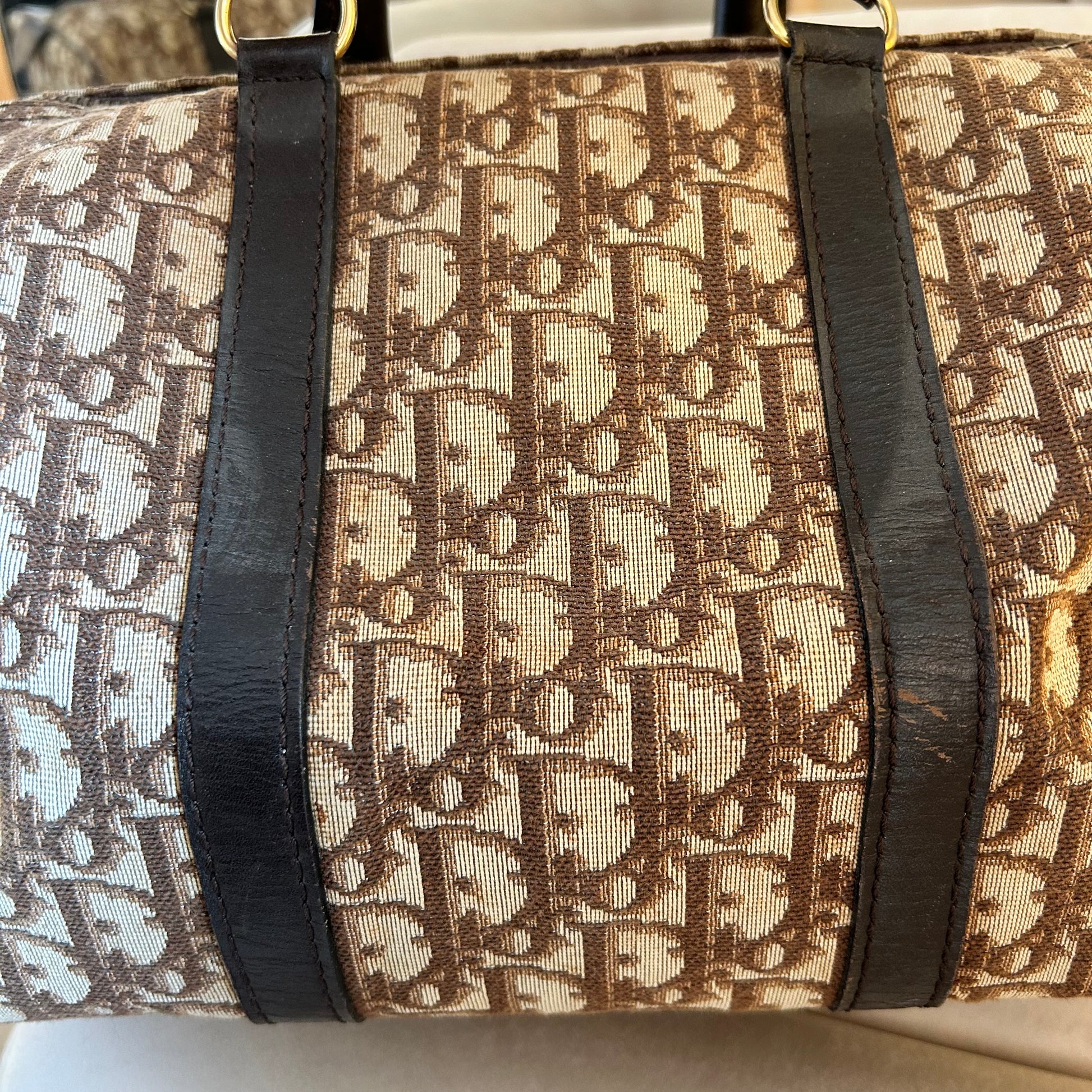 Pre-loved Dior Monogram Boston Bag in brown canvas with brown leather trim. Designed to hold all the essentials for day to day wear or travel. It opens up to a roomy beige canvas interior with one zip pocket. This bag is vintage from the 1980's but the style is a timeless classic that will bring an added sophistication to any outfit.