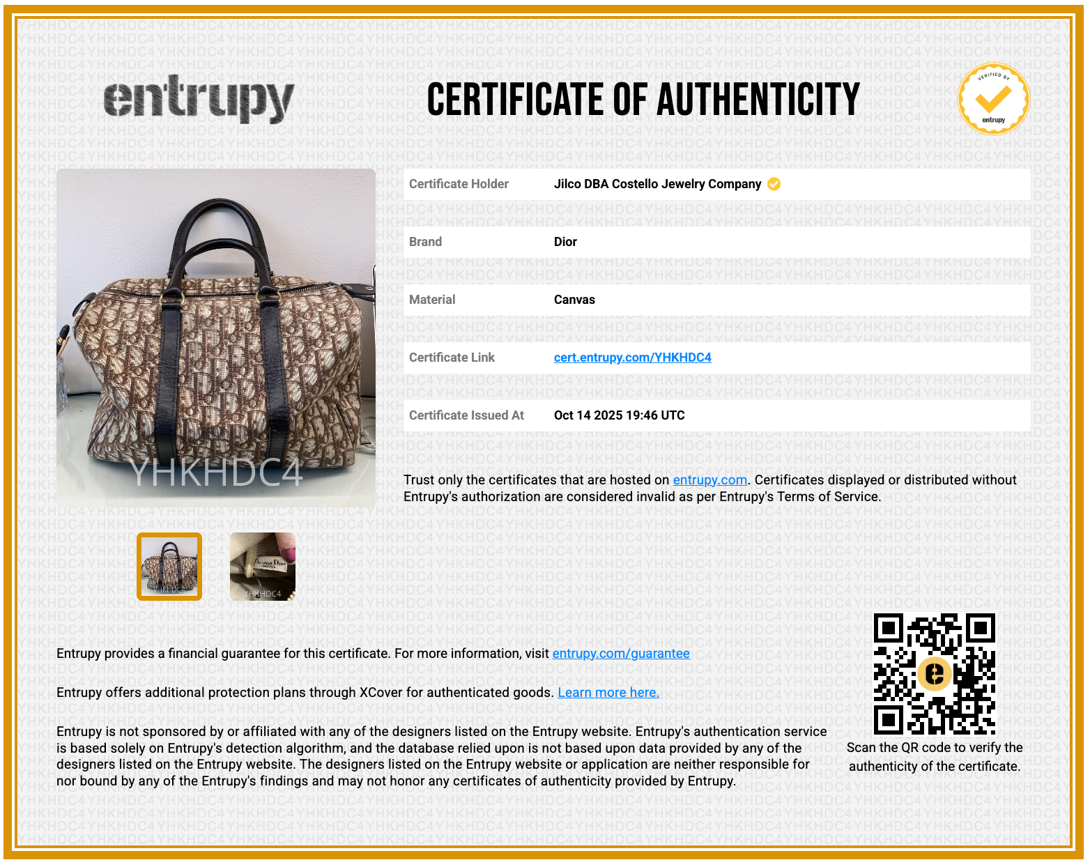Entrupy authentication guarantee - cert.entrupy.com/YHKHDC4
