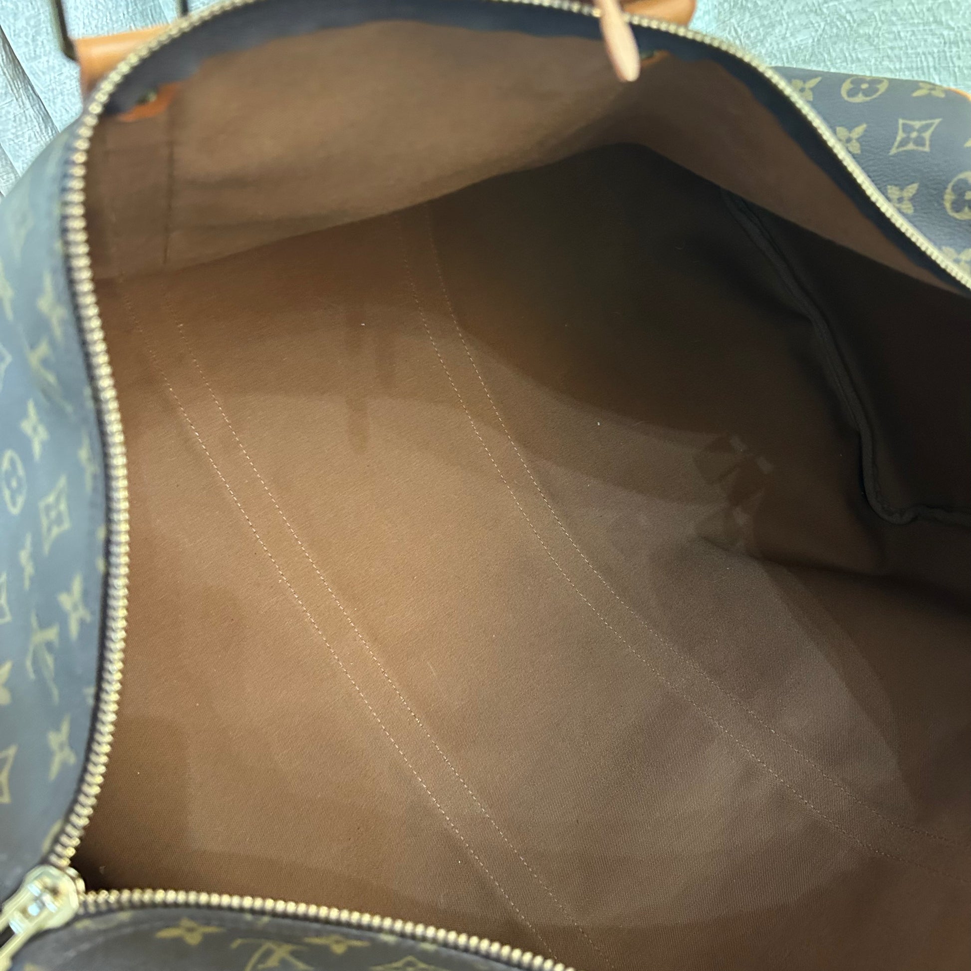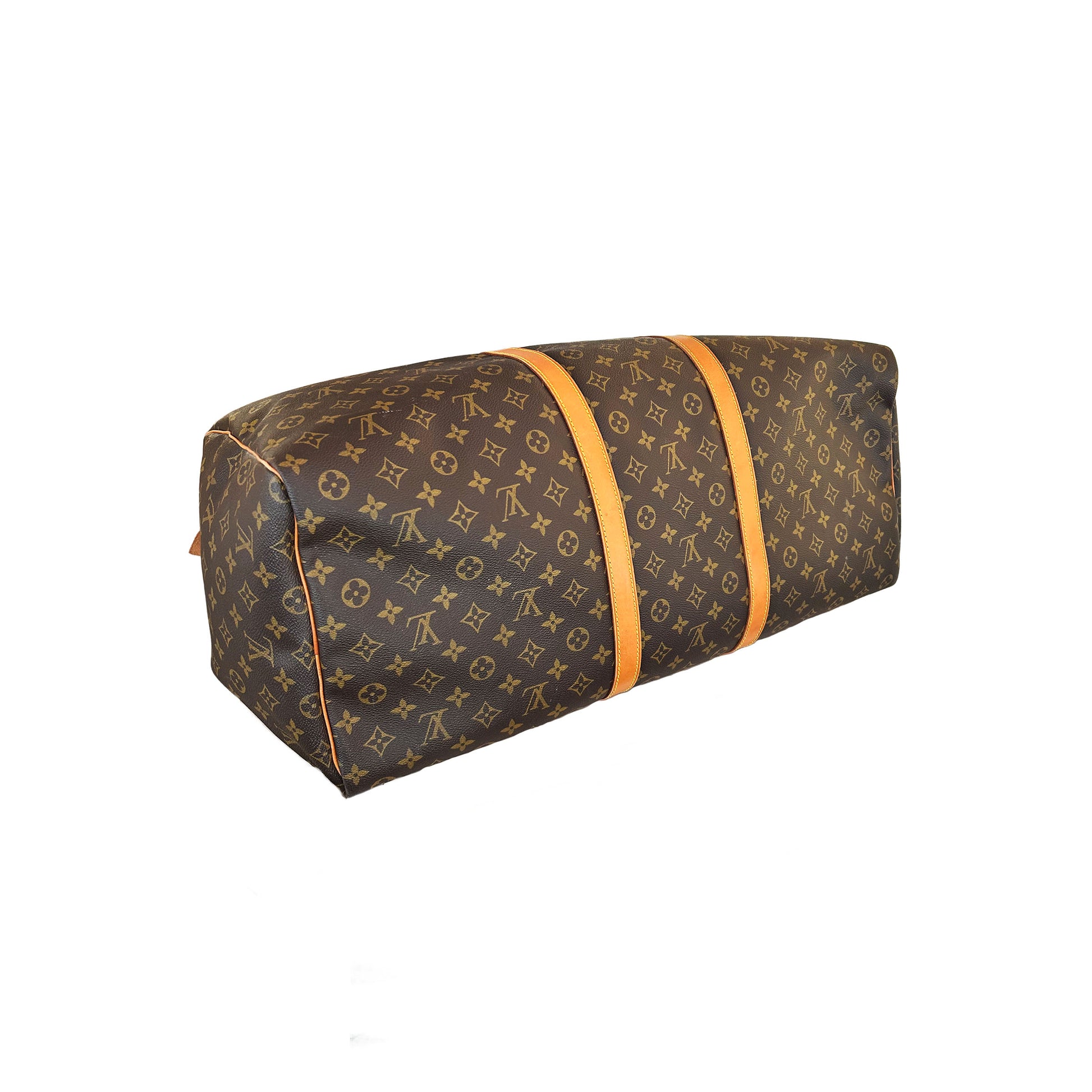 The perfect travel companion has arrived! This stylish duffel is crafted of signature Louis Vuitton monogram on coated canvas. The bag features vachetta leather trim, rolled top handles, and polished brass hardware. The top zippers open to a spacious cocoa brown fabric interior. Perfect for a weekend getaway in style.