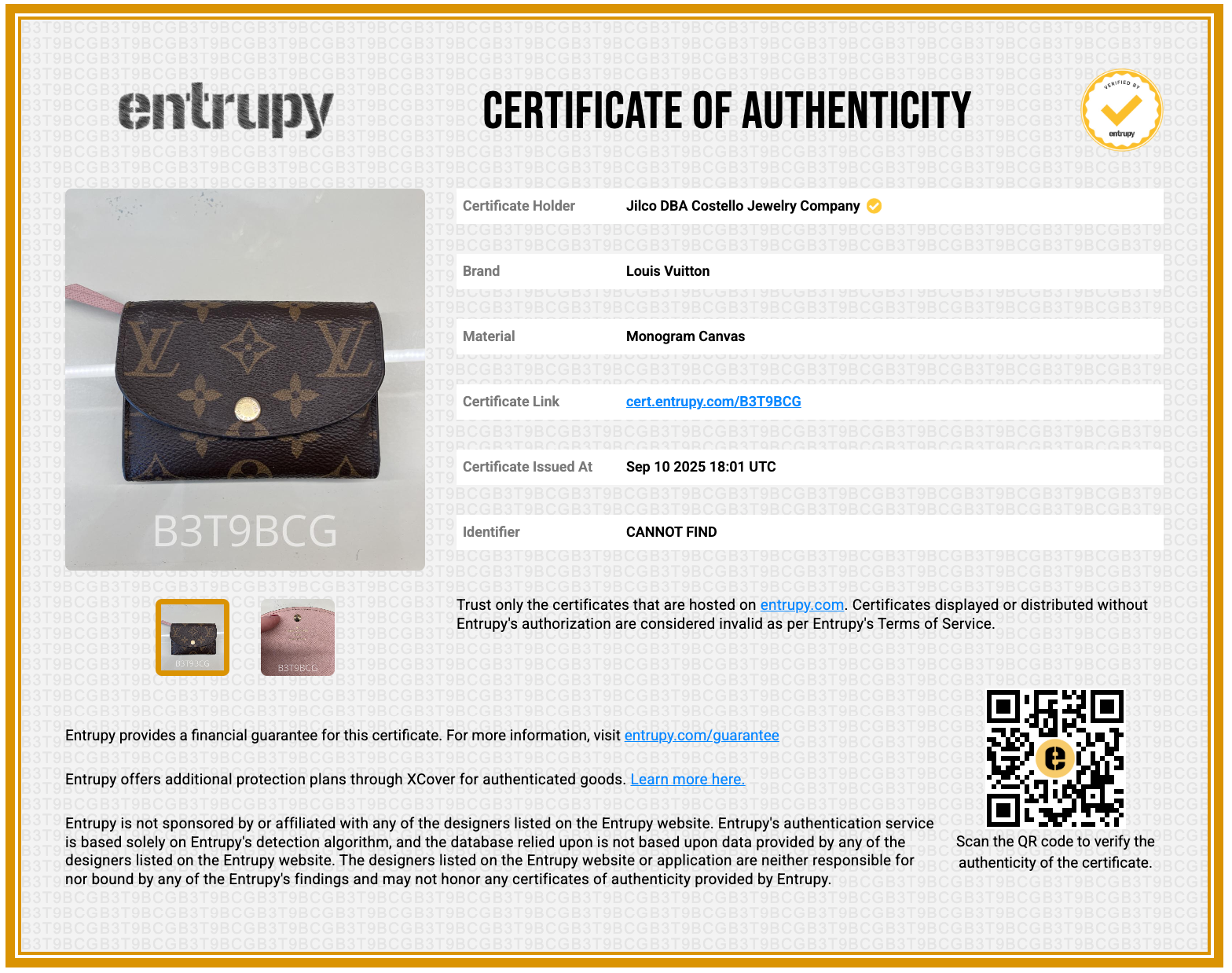 Entrupy authentication guarantee - cert.entrupy.com/B3T9BCG