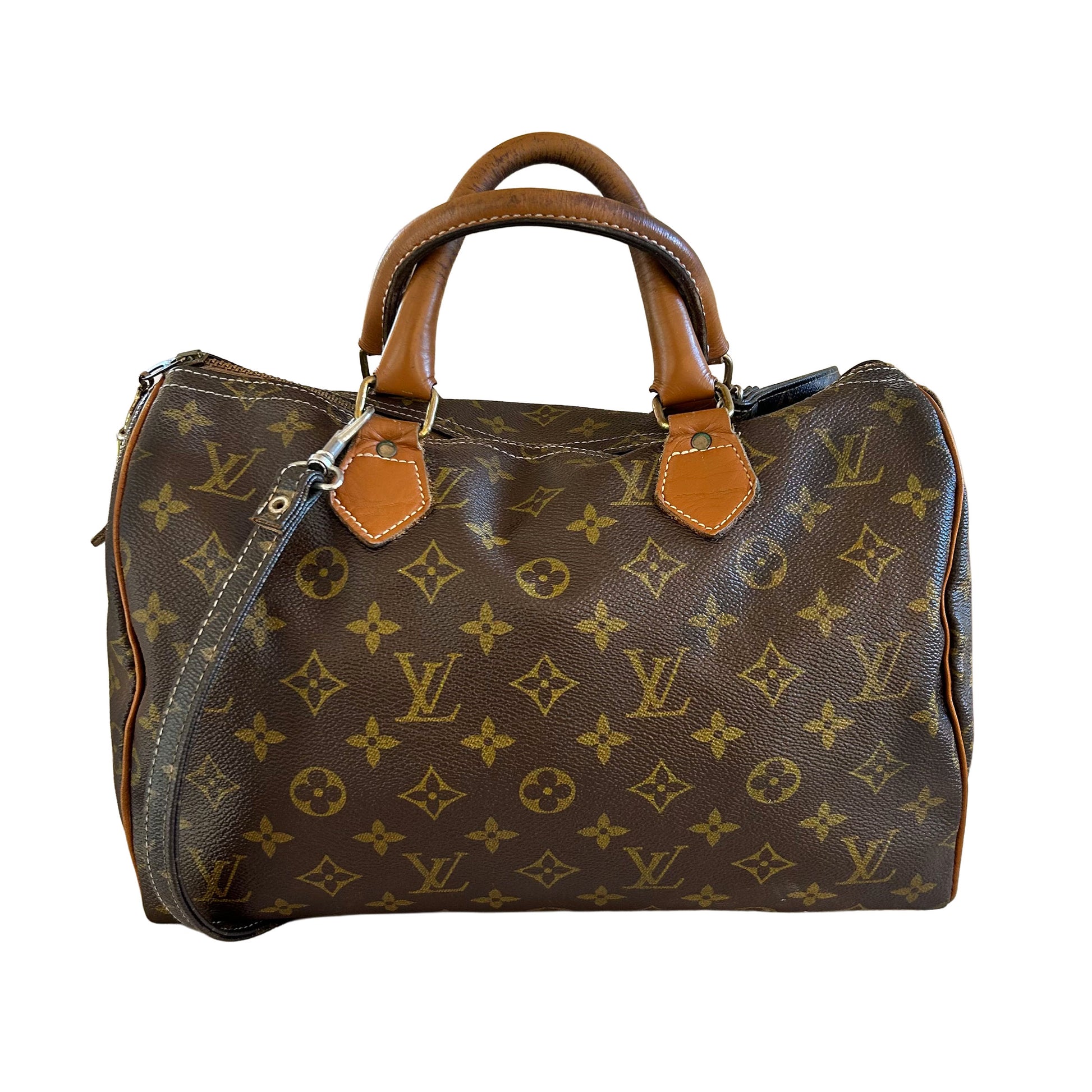 Calling all vintage lovers & collectors! This Louis Vuitton Speedy 30 bag in LV Monogram Coated Canvas is vintage circa the 1970's. I n the 1970's Louis Vuitton developed a relationship with a US Luggage Maker - The French Luggage Company. During a period from around 1976 through 1991, The French Luggage Company manufactured bags under a special license from Louis Vuitton. These items were made and sold in the United States. They were sold in exclusive department stores like Saks Fifth Avenue & Neiman Marcus. This bag has some differences with the traditional Louis Vuitton monogram speedy. The leather is a thicker and not the easily watermarked vachetta leather of current bags. It features a leather band at the bottom that keeps the bag's shape and prevents sagging. The zipper pull is Talon and combined with a Tucky lock system. No Louis Vuitton embossed on leather, no date code but there is a paper tag inside shows copyright and authority of the bag. This Speedy also comes with a detachable shoulder strap.