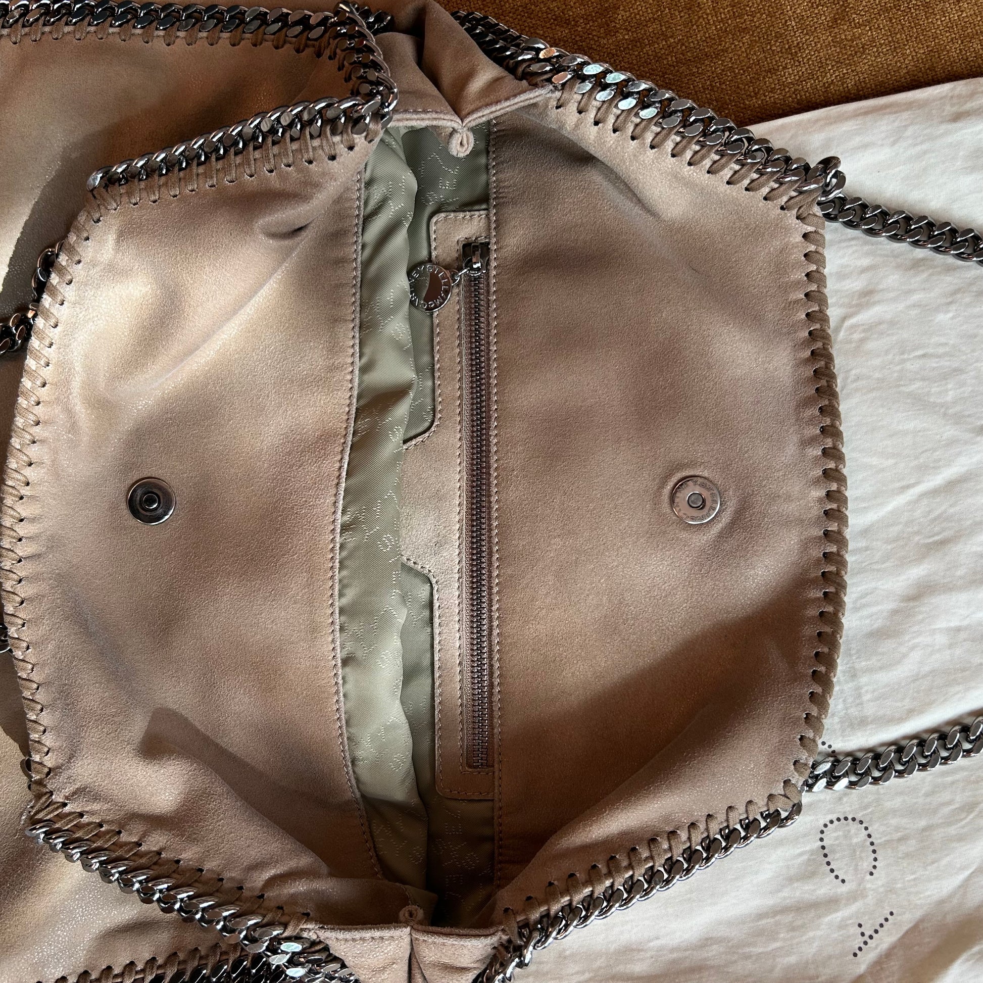 This Pre-Loved Stella McCartney Falabella Shaggy Dear Tote Bag in beige is the perfect neutral accessory to add a little bit of edginess to any outfit. This stylish shoulder bag is crafted of animal-friendly faux leather and is bordered with polished silver chain links that extent to the top handles and shoulder strap. The top opens with a magnet to a matching fabric interior with a zipper pocket and the bas is accompanied by a matching zippered leash pouch.