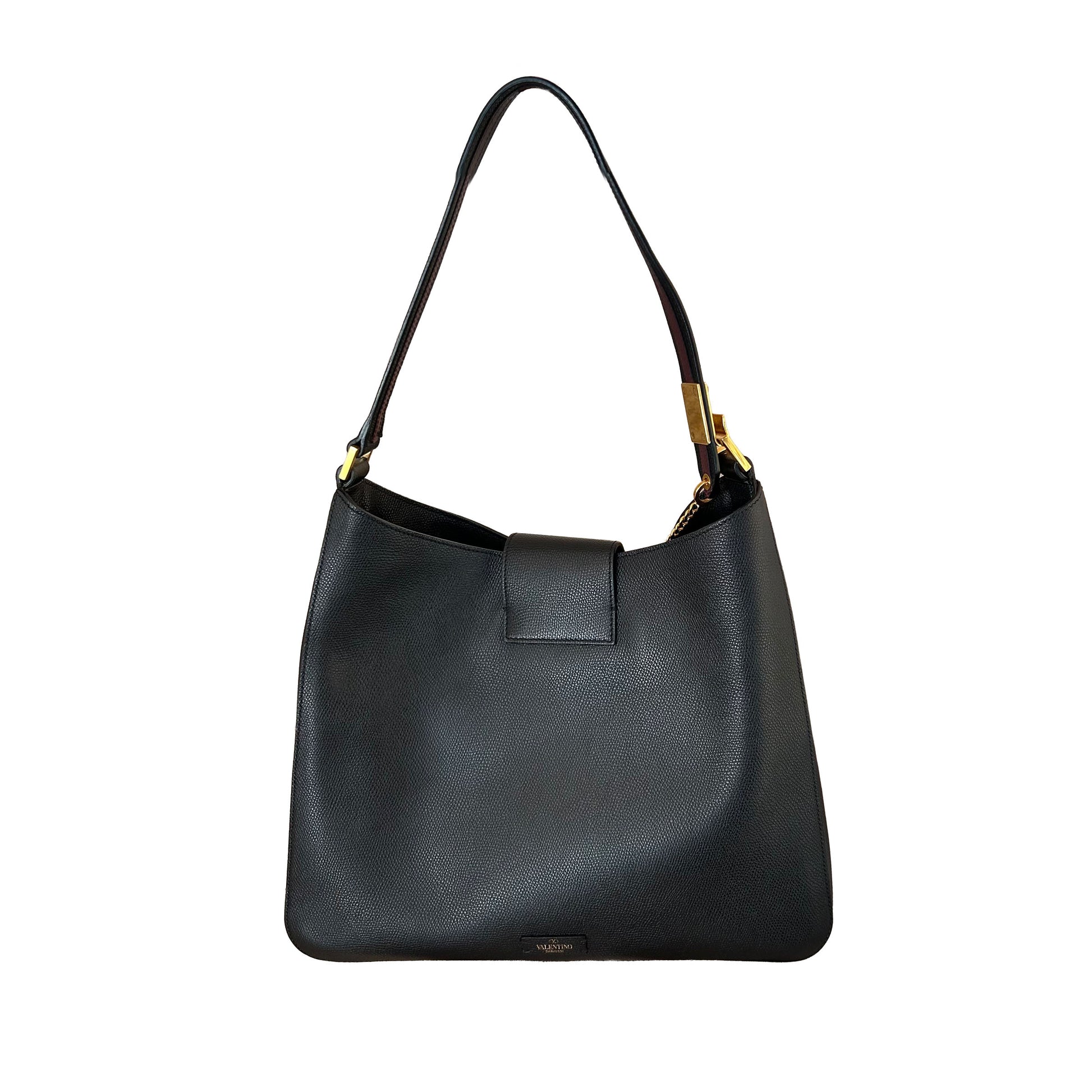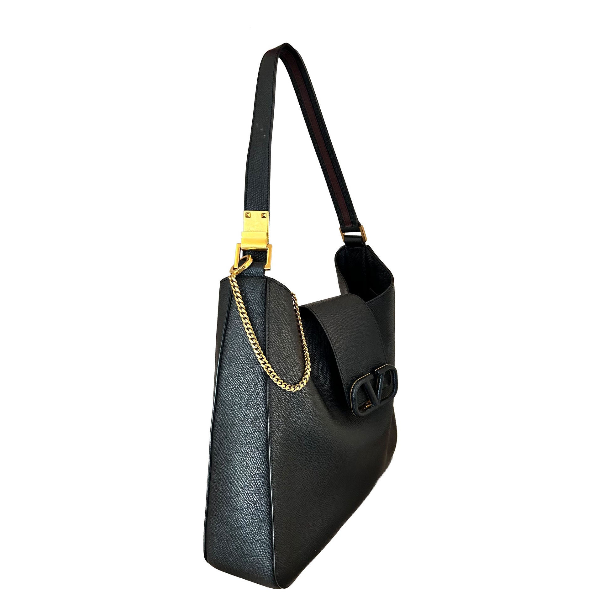 This Pre-Loved Valentino Vsling Hobo Bag is crafted of a grainy black calfskin leather and adorned with gold hardware and a classic Valentino V at the front. The bag can be worn as a shoulder or crossbody bag with the adjustable chain on the strap. It has a magnetic closure and opens up to a black and red leather interior.