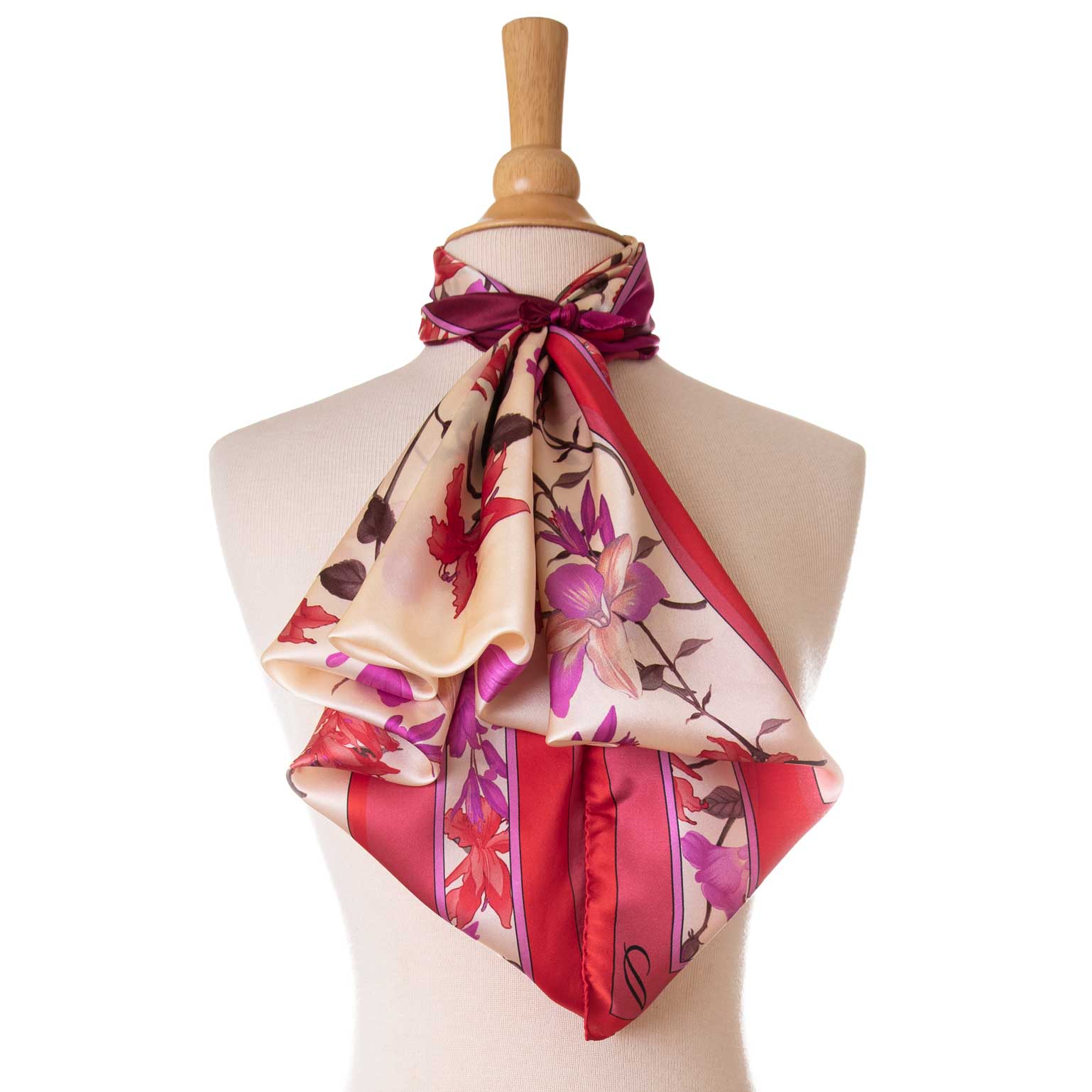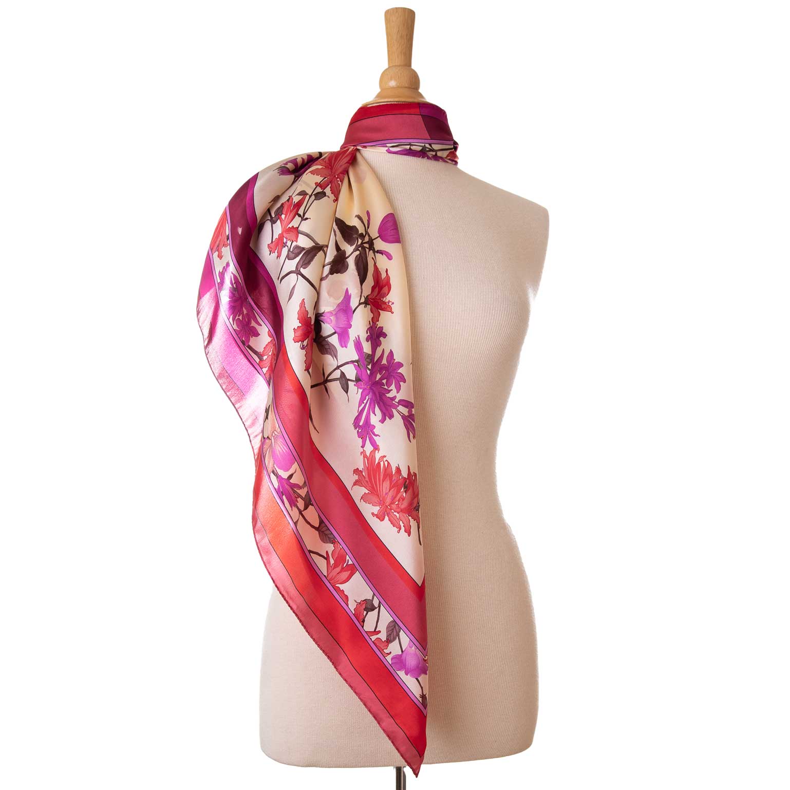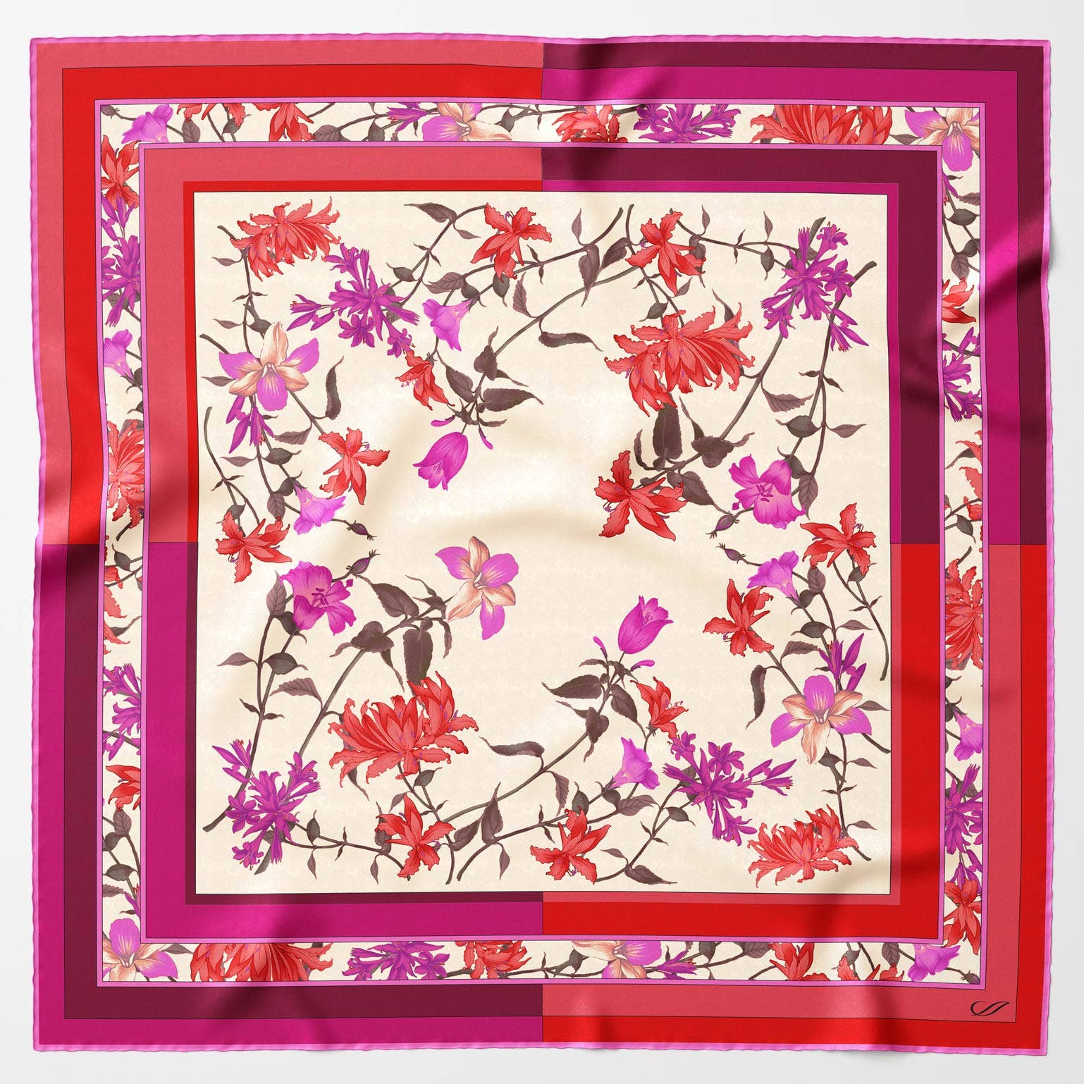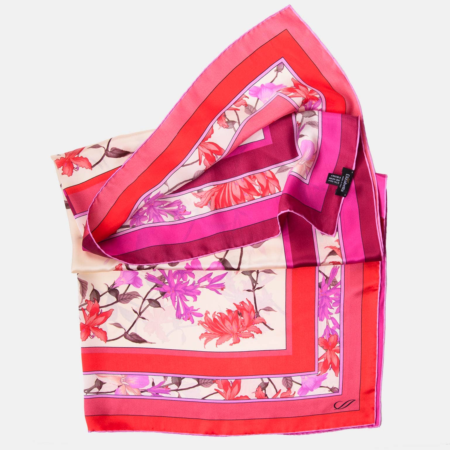 Silk Foulard Fuchsia and red square silk satin scarf made in Como, Italy. A lovely floral print to give your look a splash of this season's most popular colors.