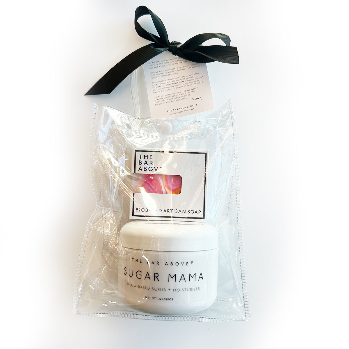 Give the gift of ultimate relaxation at home! The Bar Above Sugar Mama gift set includes one Sugar Mama scrub and one artisan made bar of soap.